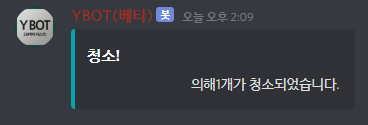 =청소라는 명령어가 단독적으로 들어오면 사용법을 알려줍니다. 만약에 숫자가 들어온다면, "누구에 의해 몇 개가 삭제되었습니다."라고 반환합니다. 물론 여기서 봇이 메시지 관리 권한이 없을 경우에는 예외 값으로 discord.Forbidden이라는 것이 반환되게 됩니다. 이럴 경우 권한이 부족하다고 통보하게 되며