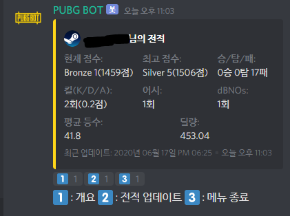 참고로 지금 PUBG BOT의 테스트를 위해 현 버전)으로 임시 패치중입니다. !=전적 [일반(3인칭)/랭크/1인칭] [닉네임(선택)] [시즌(선택)]을 사용하여 체험해보세요!