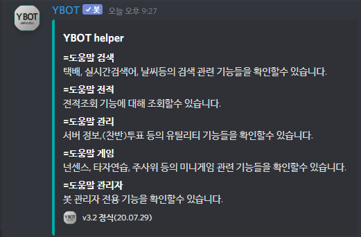 "help"명령어를 이제 "help", "명령어", "도움", "도움말"로 접할 수 있게 되었으며, 기타에 있던 복잡한 기능들이 관리/게임/이모지로 분리되었습니다.