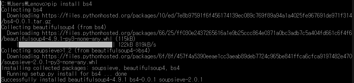 3. "py -3 -m pip install requests bs4" 를 작성합니다.