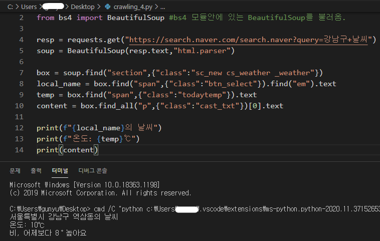 그리고 requests를 통해 강남구 날씨를 불러오고 soup 변환작업까지 끝났다는 상태에서 작업해보겠습니다.