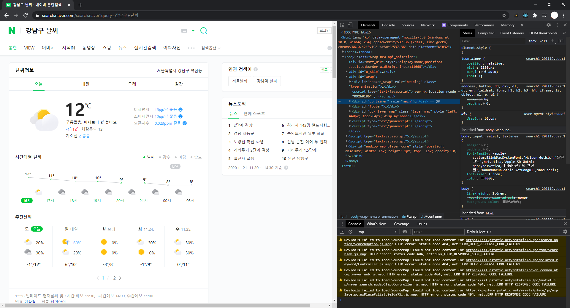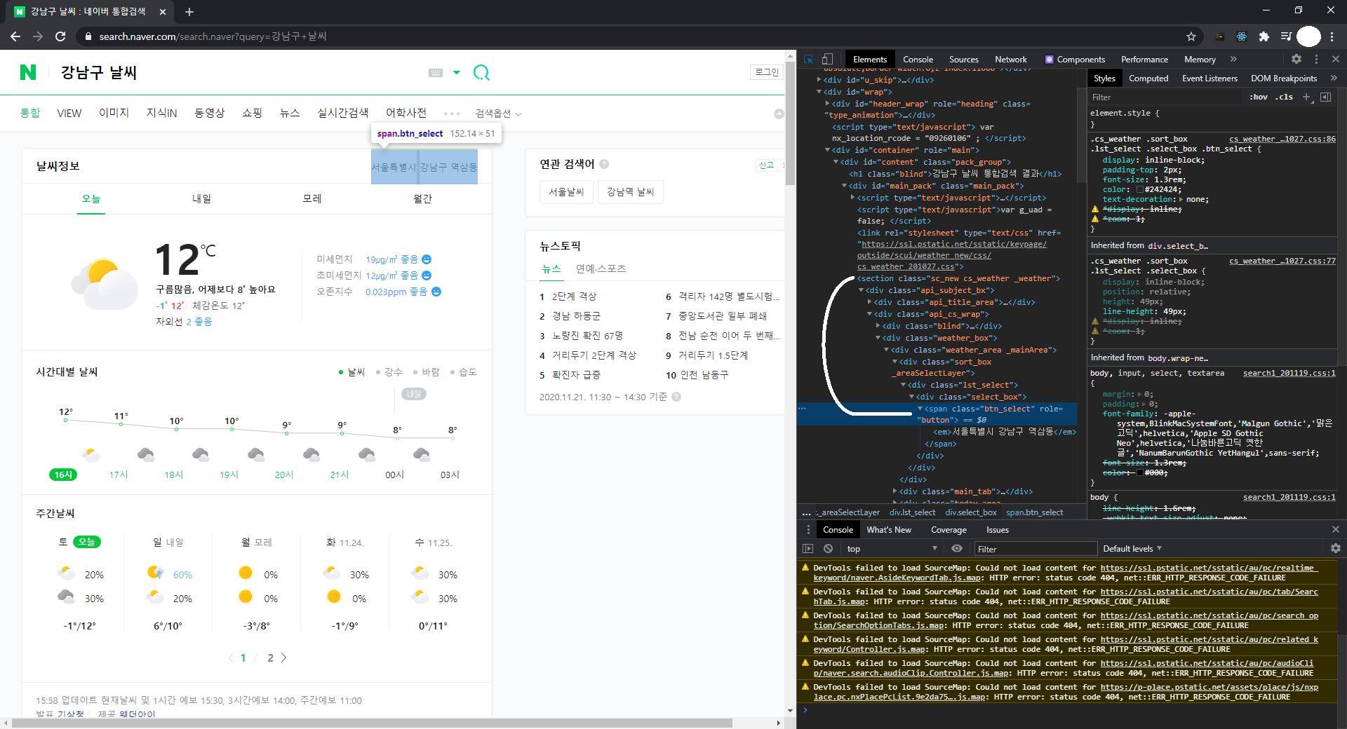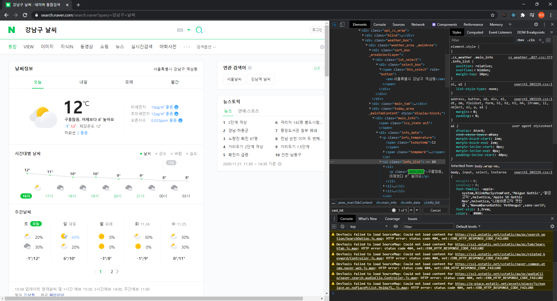 우리가 필요한 값은 날씨 정보 오른쪽에 있는 "서울특별시 강남구 역삼동"과, 아래 "12℃", 그리고 그 위에 적혀있는 문구를 가져와 보도록 하겠습니다.