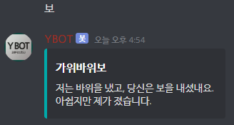 만약 이겼는지, 비겼는지, 졌는지 판단이 끝나면, 값을 보내주고 함수가 끝나게 됩니다. 이 기능은 YBOT에 실제로 탑재한 기능 중 하나이며, 실제로 YBOT을 통하여 이용해 보실수 있습니다.