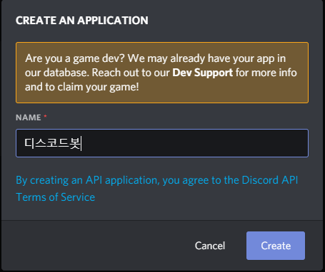 그다음에는 디스코드 애플리케이션의 명칭을 정해줍니다. 이곳은 실제로 초대하거나 봇을 불러올 때 이름이 되지 않습니다. 저는 편하게 "디스코드 봇"이라고 짓어주었습니다.