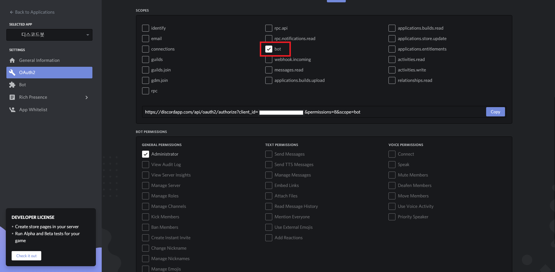 이후 SCOPES에서 bot을 택한 후 아래에서 봇 권한을 택해주시면 편리하게 봇 링크를 있습니다.