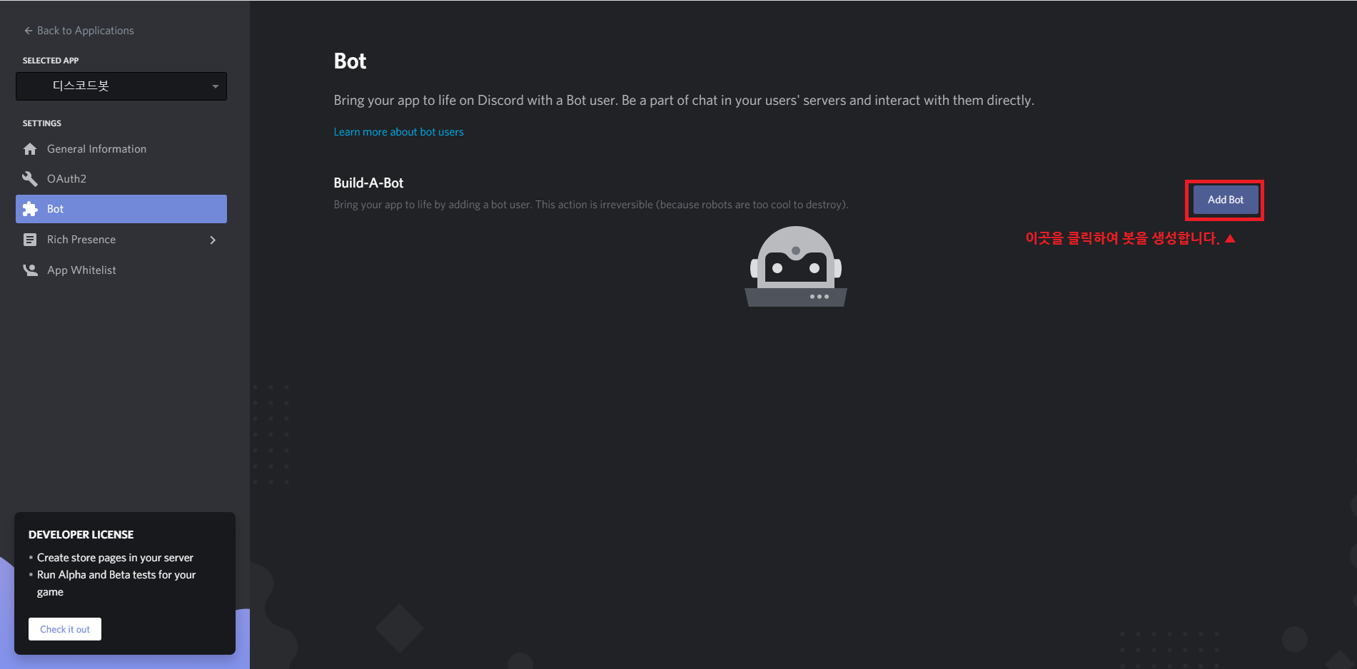 위 창에 들어오게 된다면 "Add Bot"을 클릭하여 봇을 만들어 줍니다.