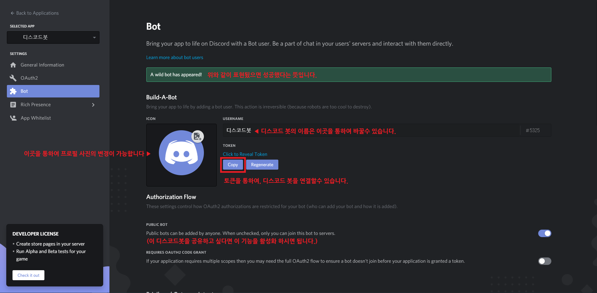 이제 성공적으로 제작되면 "A wild bot has appeared!"라고 표시됩니다. 이제 아이콘을 통해 디스코드의 프로필 사진을 변경하실 수 있습니다. 또한 TOKEN이라는 곳을 통하여, 디스코드 봇과 파이썬을 서로 연결시켜줄 수 있으며 USERNAME이라는 곳을 통해 디스코드 봇의 닉네임을 정해줄 수 있습니다.