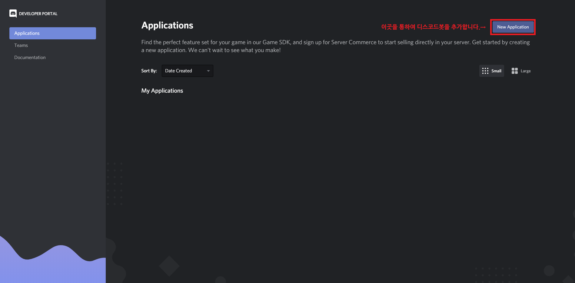 디스코드 개발자 포털에 들어가셨다면 위 상태가 될 것입니다. 이 상태에서 "New Application"을 클릭합니다.