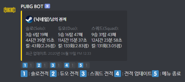 또한 이제부터는!=카배,!=스배를 통해 두 플랫폼 구별만 가능했지만 이제부터는!=전적이라는 한 명령어로 통합되었습니다 한번 사용해보시는 건 어떨까요?