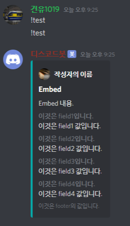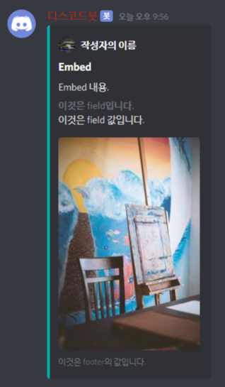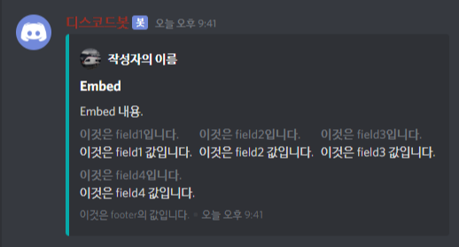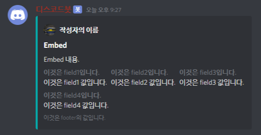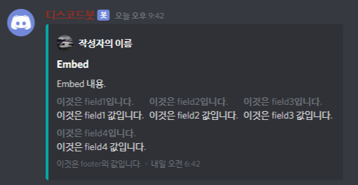embed=discord.Embed(title="Embed", description="Embed 내용.", color=0x00aaaa) embed.set_author(name="작성자의 이름",icon_url=message.author.avatar_url) embed.add_field(name="이것은 field1입니다.", value="이것은 field1 값입니다.", inline=False) embed.add_field(name="이것은 field2입니다.", value="이것은 field2 값입니다.", inline=False) embed.add_field(name="이것은 field3입니다.", value="이것은 field3 값입니다.", inline=False) embed.add_field(name="이것은 field4입니다.", value="이것은 field4 값입니다.", inline=False) embed.set_footer(text="이것은 footer의 값입니다.") await message.channel.send(embed=embed)